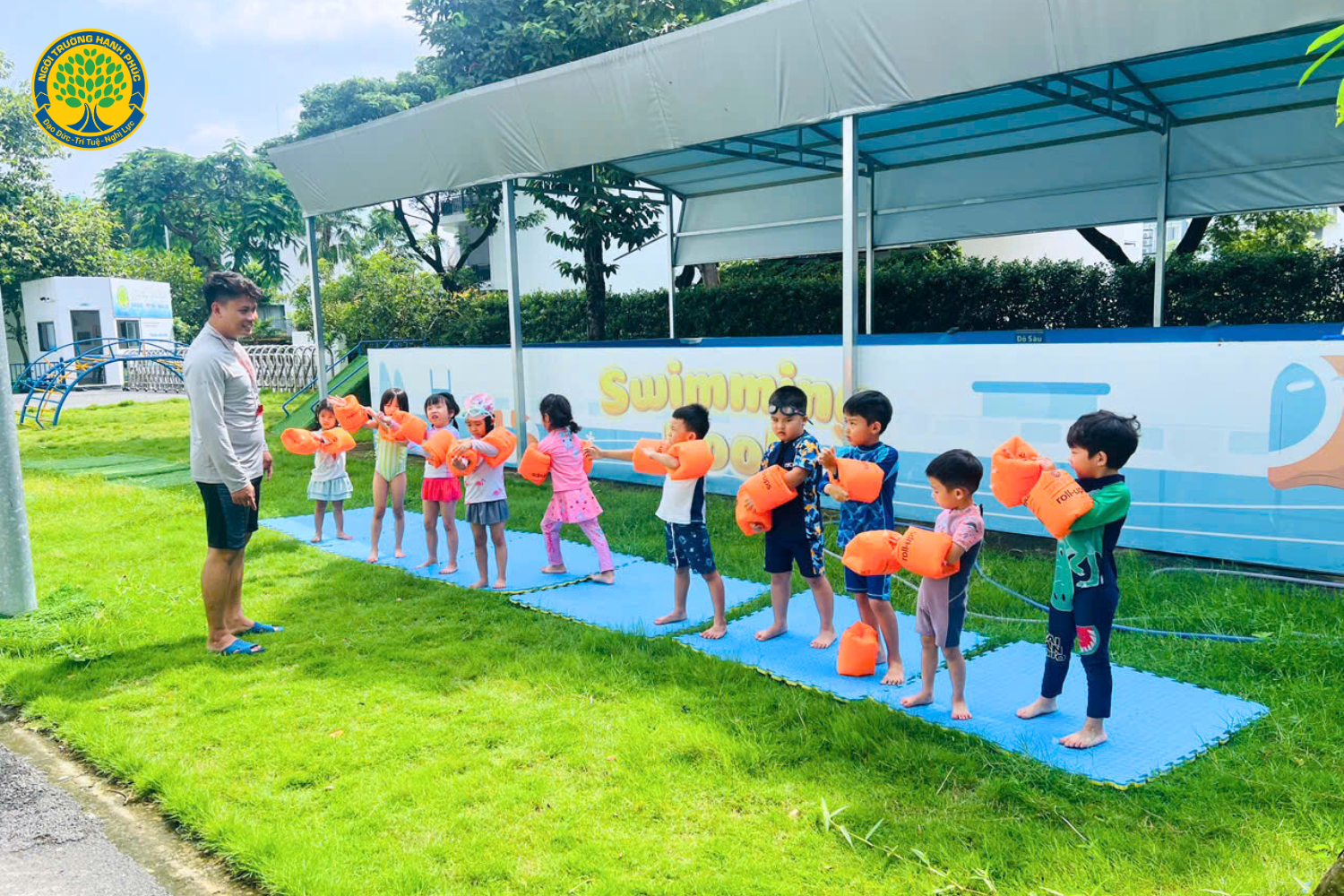 Trong làn nước mát lành, tiếng cười vang lên rộn rã, các bạn nhỏ Mầm...